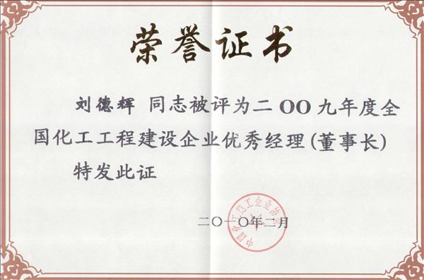 近日,經(jīng)中國化工施工企業(yè)協(xié)會評定,公司榮獲2009年度全國化工工程建設(shè)優(yōu)秀企業(yè),公司總經(jīng)理、黨委書記劉德輝榮獲“2009年度全國化工施工企業(yè)優(yōu)秀經(jīng)理(董事長)”光榮稱號。