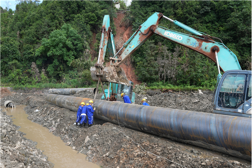 下午13:00,應急搶險突擊隊抵達平江后,隨即爭分奪秒展開搶險修復工作。隊員們頂著高溫和烈日,30分鐘完成現場踏勘,確定施工方案,并著手對13根12米長的DN1200管道進行對口、點焊、焊接、下管,全面開展搶修工作。