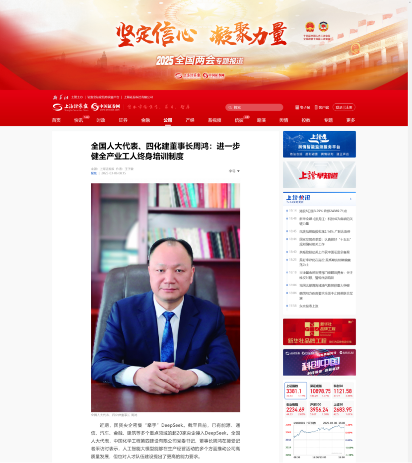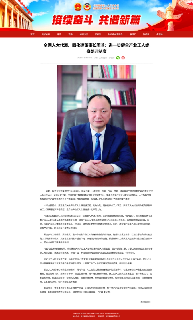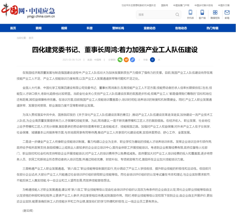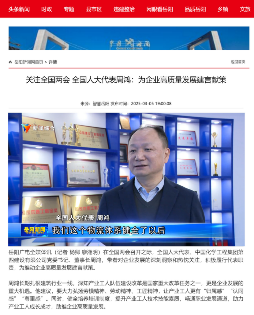 2025年全國兩會期間,全國人大代表,中國化學四化建黨委書記、董事長周鴻向大會提交《關于加強產業工人隊伍建設的建議》《關于多措并舉解決拖欠建筑施工企業工程款的建議》《關于推動洞庭湖區常岳九鐵路、荊岳鐵路、監利至華容至益陽鐵路規劃建設提速的建議》《關于修改最高法院〈關于大型企業與中小企業約定以第三方支付款項為付款前提條款效力問題的批復〉的建議》等4條建議,受到主流媒體深入報道,引起社會各界廣泛關注。