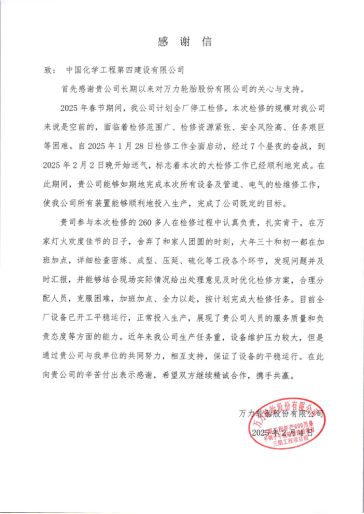 近日,華南公司從化萬力輪胎三期項目團隊收到萬力輪胎股份有限公司發(fā)來的感謝信。信中高度贊揚公司項目團隊在2025年春節(jié)期間高效完成全廠停工大檢修任務(wù),以專業(yè)能力和責任擔當助力業(yè)主實現(xiàn)“開門穩(wěn)、開門紅”。