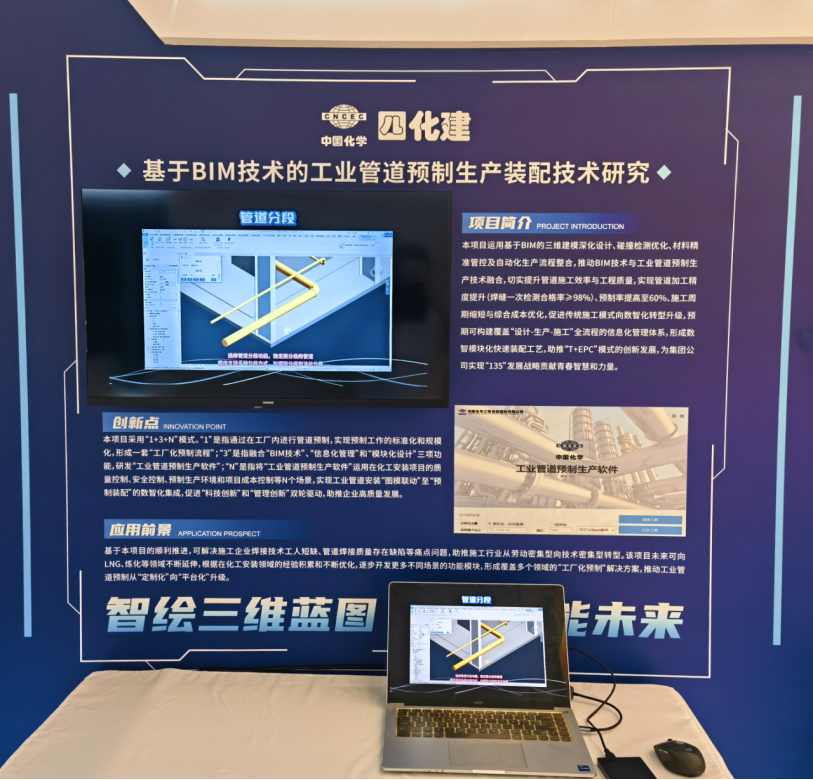 會議期間,舉行了中國化學首屆青年創(chuàng)新創(chuàng)效展,公司青年創(chuàng)新創(chuàng)效項目——基于BIM技術(shù)的工業(yè)管道預制生產(chǎn)裝配技術(shù)研究項目亮相展會,通過視頻、圖文及展板講解等多種形式,全方位展示了項目成果。該項目通過“1+3+N”模式推動施工數(shù)字化轉(zhuǎn)型,預制率提升至60%,為傳統(tǒng)施工模式注入數(shù)智化動力。