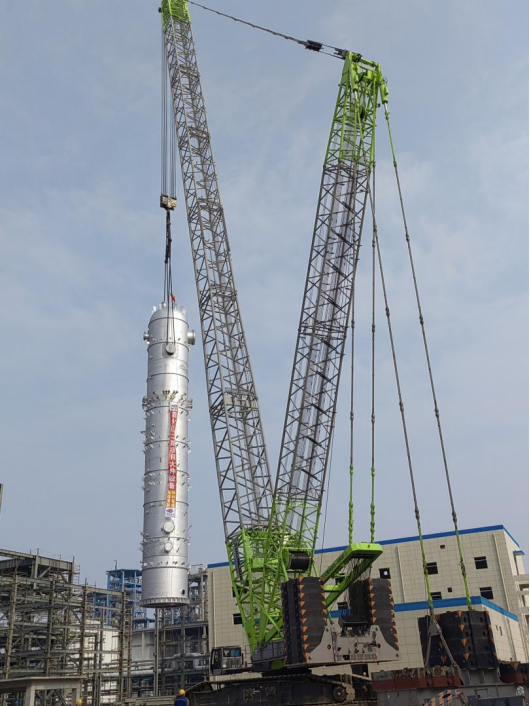 該氧氯化反應(yīng)器自重257.2噸,是項(xiàng)目裝置的關(guān)鍵設(shè)備。為確保安全優(yōu)質(zhì)高效完成氧氯化反應(yīng)器吊裝,項(xiàng)目部克服設(shè)備進(jìn)場路線難、設(shè)備滯后等多種不利因素的影響,多次組織召開施工協(xié)調(diào)會(huì),根據(jù)現(xiàn)場實(shí)際情況制定周密吊裝方案,并在吊裝前對參與吊裝的人員進(jìn)行了安全技術(shù)交底。吊裝現(xiàn)場采用800噸履帶吊、600噸汽車吊溜尾遞送吊裝。經(jīng)過吊裝人員通力合作,氧氯化反應(yīng)器平穩(wěn)起升、扳起、回轉(zhuǎn)、就位,一次順利完成吊裝。
