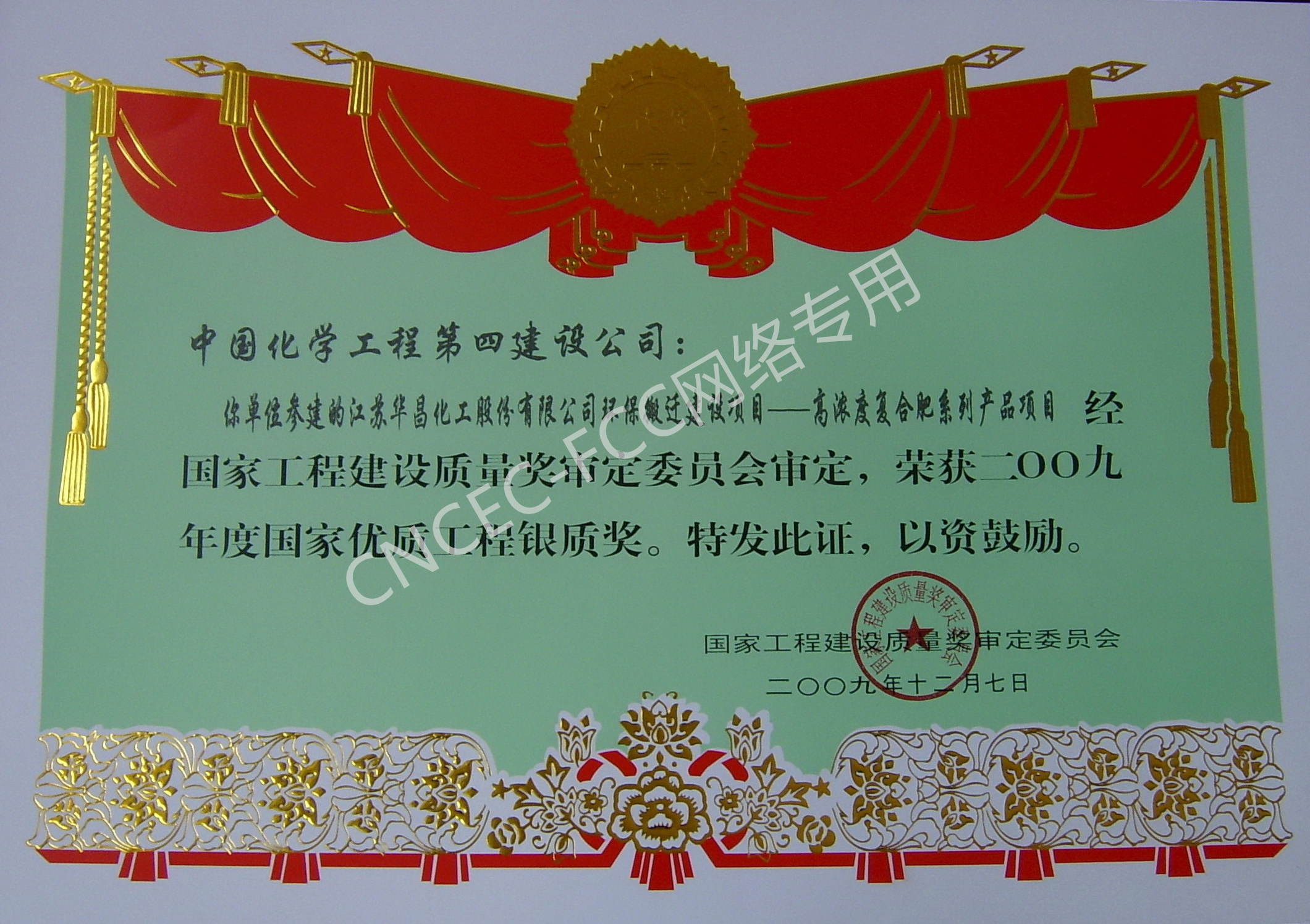 江蘇華昌化工股份有限公司環(huán)保搬遷建設項目—高濃度復合肥系列產(chǎn)品項目國家優(yōu)質(zhì)工程銀質(zhì)獎